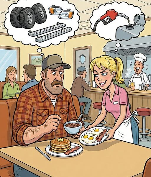 Der Trucker lehnte sich zurück und sagte: „Na schön, Liebes – bring mir drei Reifenpannen, zwei Fernlichter und ein paar Trittbretter.“